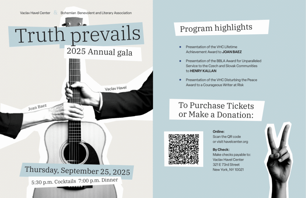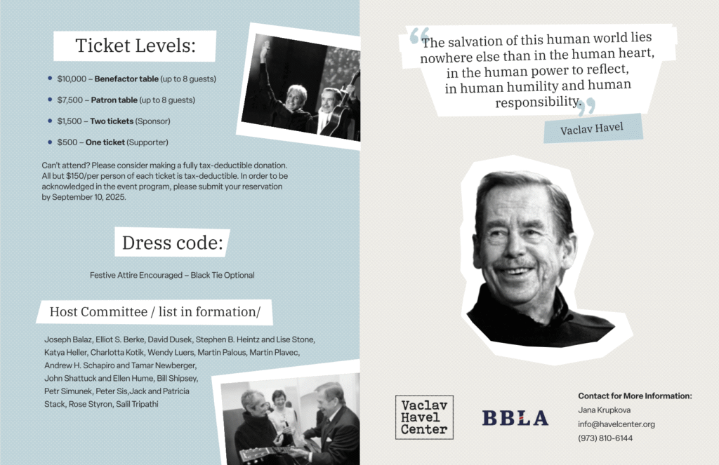 This event is organized by the Vaclav Havel Center & the Bohemian Benevolent and Literary Association. All proceeds will benefit the Vaclav Havel Center, a not-for-profit organization established in the United States that promotes democratic freedoms, universal human rights, and the power of the arts to uplift and transform our lives in the spirit of Vaclav Havel.